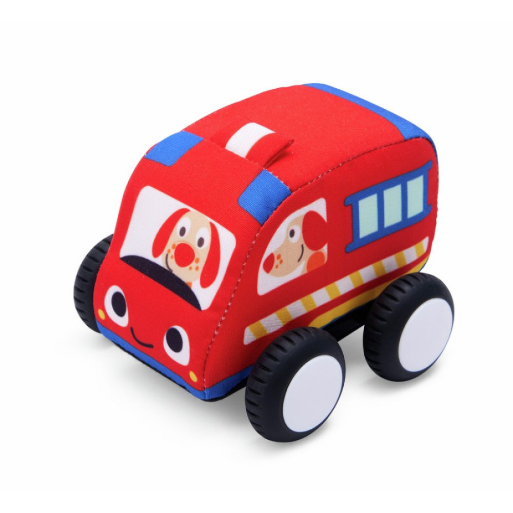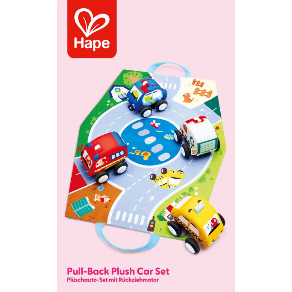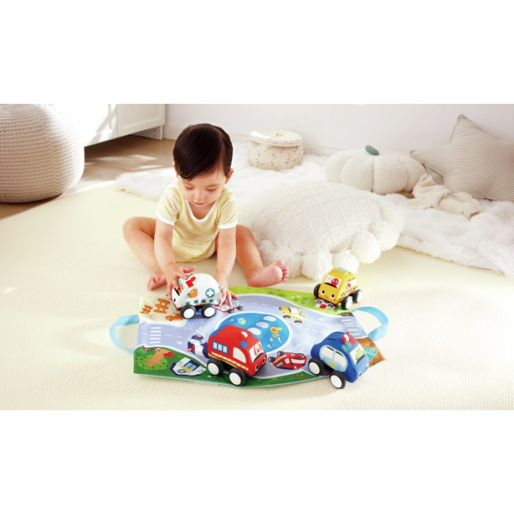 +6 A 24 MESES Este suave y veloz juego de coches de peluche incluye un camión de bomberos, un coche de policía, una ambulancia y un taxi, cada uno con su propio conductor de animal. Fabricados con tejido de felpa apto para niños pequeños y con resistentes motores retráctiles, cada coche se desplaza por el suelo para un juego emocionante y sin ruidos. Una bolsa de almacenamiento desplegable sirve de alfombrilla de juego para que la limpieza forme parte de la aventura. El juego todo en uno perfecto para los niños en movimiento.