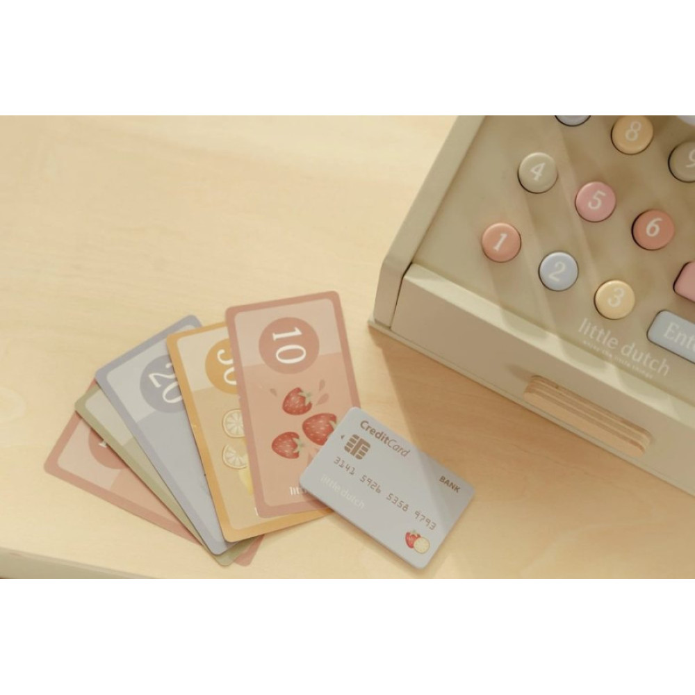 +3 AÑOS ¡Calcula, escanea y paga! Con esta caja registradora de madera, jugar a las tiendas se siente aún más real. La caja está equipada con un escáner, un lector de tarjetas, botones y un cajón para monedas y billetes. También incluye una tarjeta bancaria, para que los clientes puedan pagar con efectivo o tarjeta. Una forma fantástica de aprender sobre el dinero y los números de forma lúdica.¿Qué comprarás hoy?