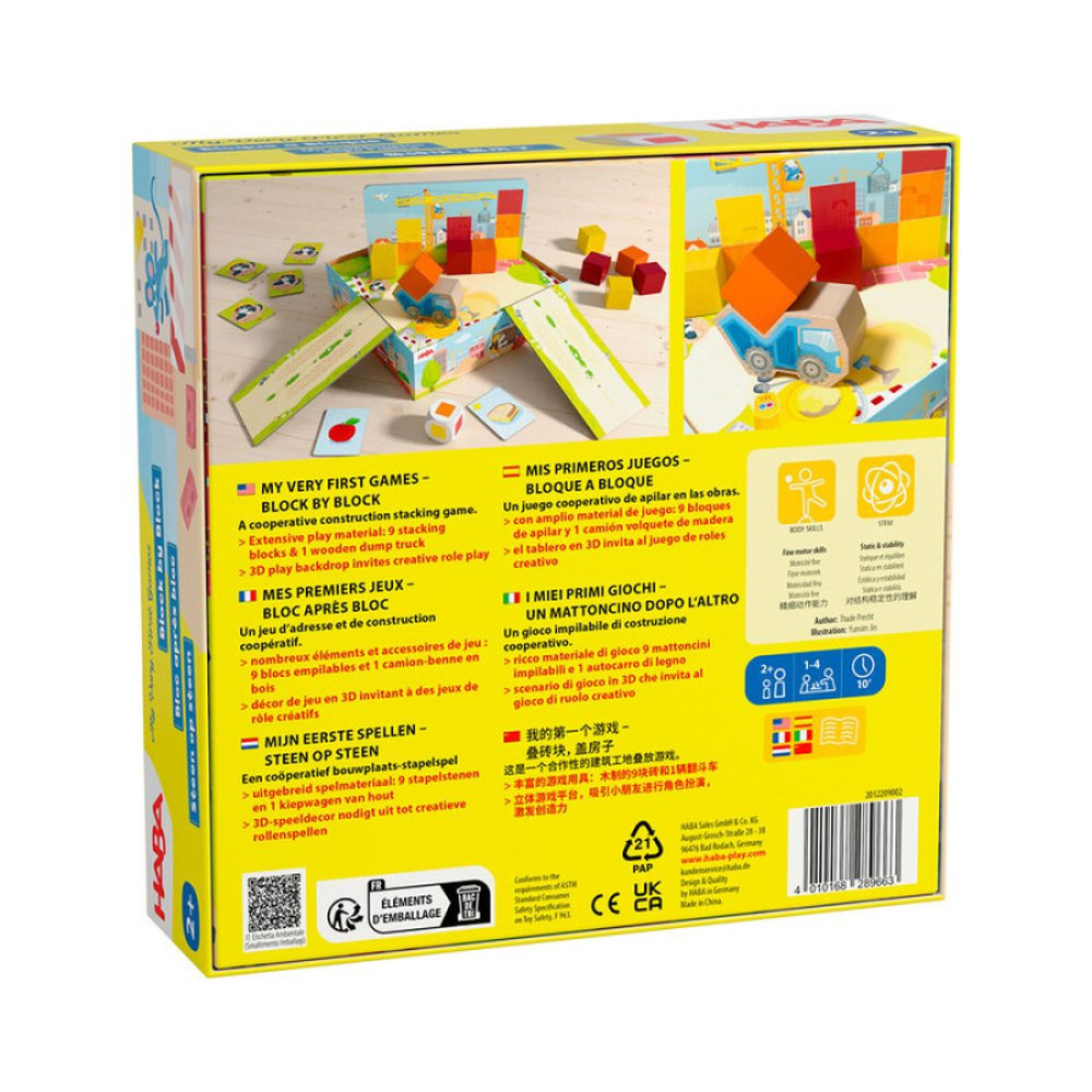 +2 AÑOS ¡En las casas de Haba no paran de suceder cosas! Se construye en todos los rincones. Planta a planta, bloque a bloque, se van alzando nuevas casas. ¡Toca arremangarse y echar una mano! Los niños/as acercan con el camión volquete los bloques de construcción. COMO SE JUEGA A BLOQUE A BLOQUE