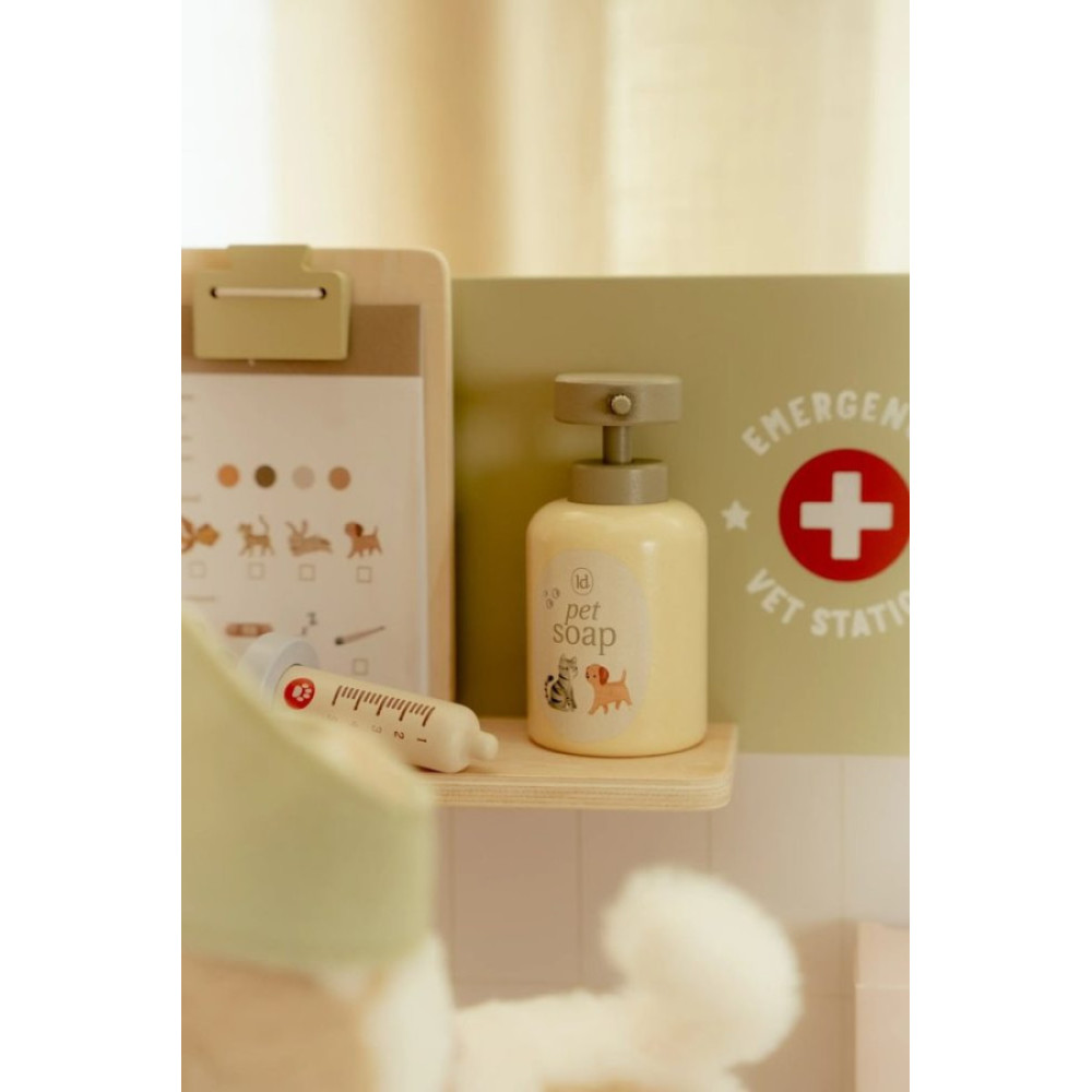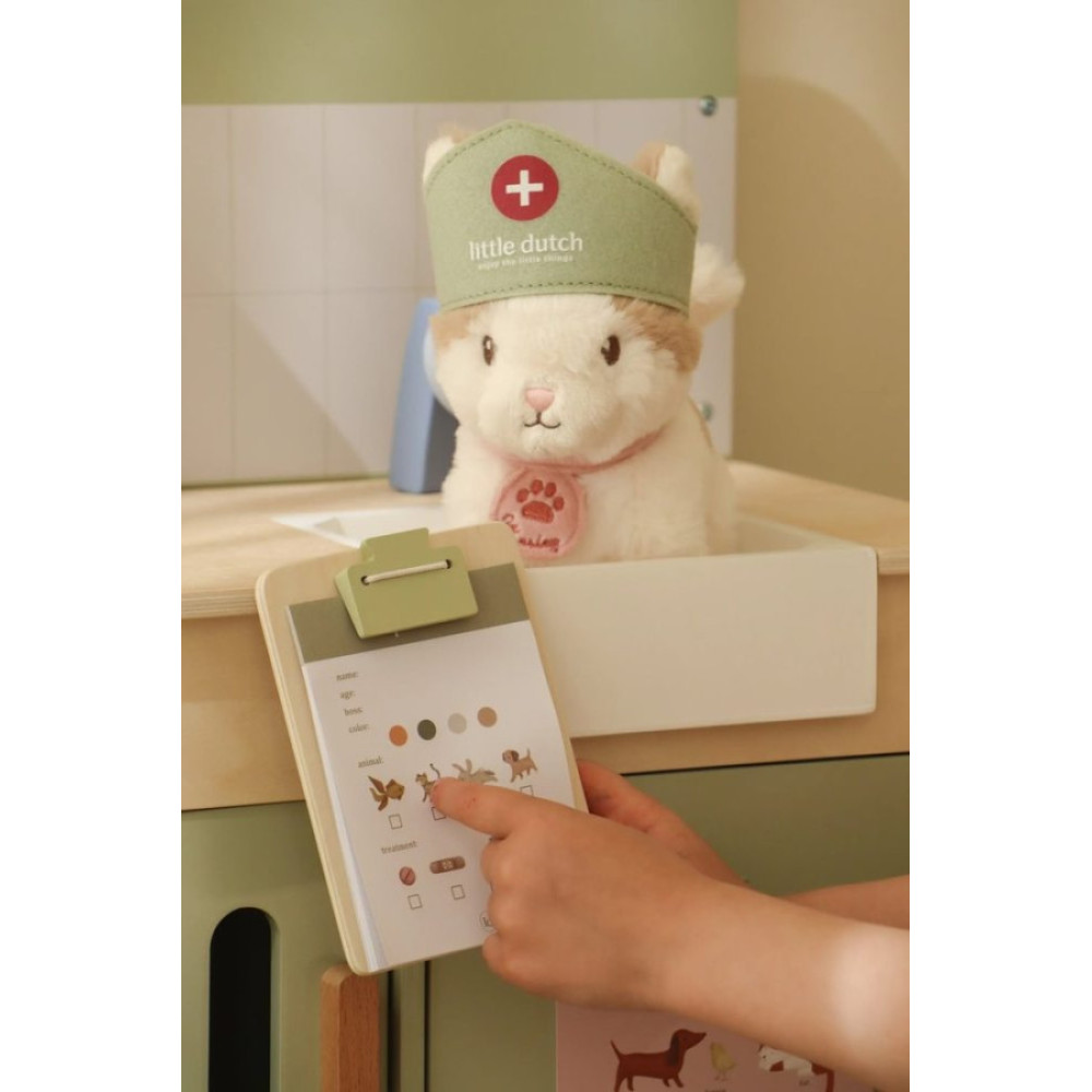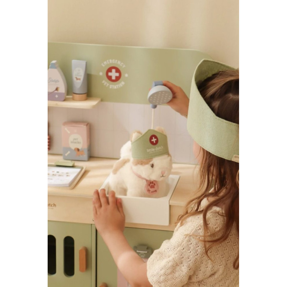 +3 AÑOS ¿Cuidas bien de peluches y mascotas de juguete enfermas? Con esta amplia clínica veterinaria de madera, tu pequeño podrá sumergirse por completo en el rol de un veterinario de verdad. El set contiene todo lo necesario para cuidar mascotas, como una ducha retráctil con lavabo, un peine, un termómetro, una jeringa y vendas. También incluye una diadema de tela y un clip especial para mostrar ilustraciones médicas y radiografías. ¡Hora del siguiente paciente!