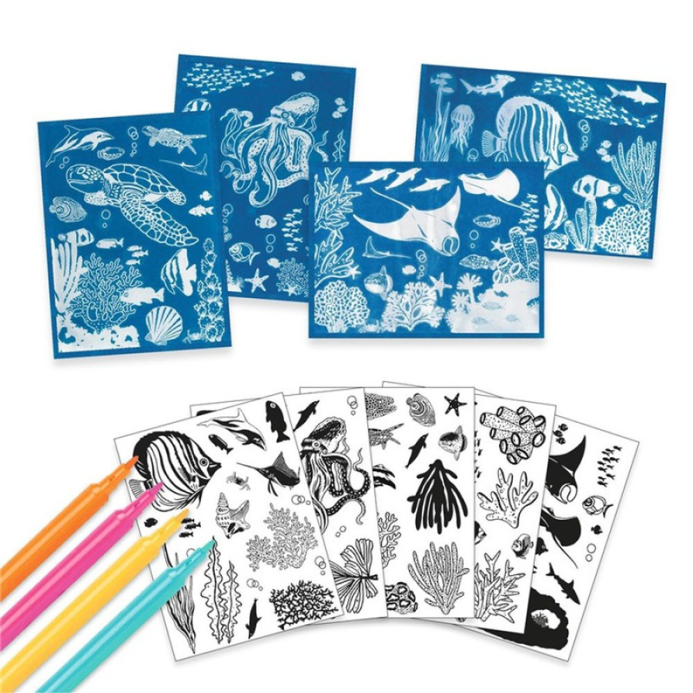 +7 AÑOS El Taller de Cianotipia. Ultramar de Djeco es un kit con el que te inspirará la magia del mundo marino y crearás tus propias obras de arte únicas. Usando la luz del sol y varias plantillas, podrás crear increíbles imágenes azules. El kit incluye todo lo que necesitas para iniciar tu viaje artístico: papel fotosensible, plantillas de acetato, marcos e instrucciones detalladas.