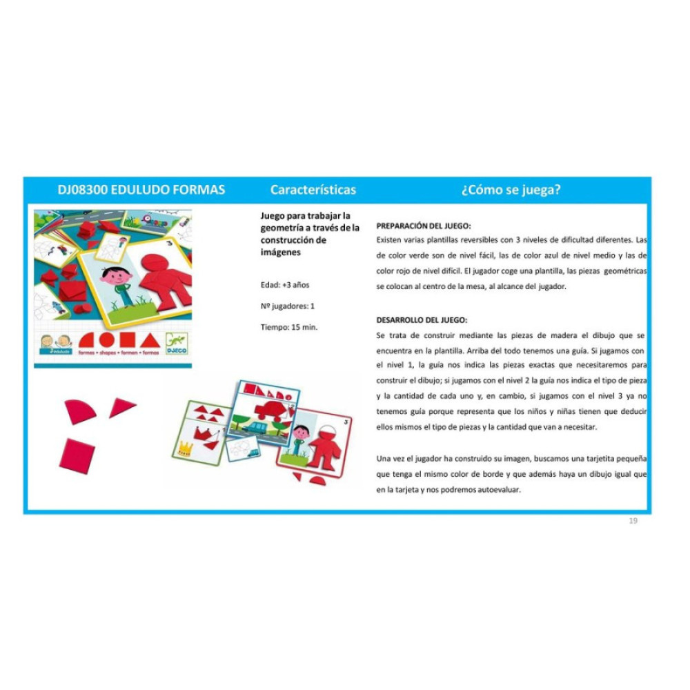 +3 AÑOS -Un juego de la colección Eduludo para aprender geometría de una manera simple y divertida y descubrir formas de manera lúdica. Se incluyen las soluciones.
