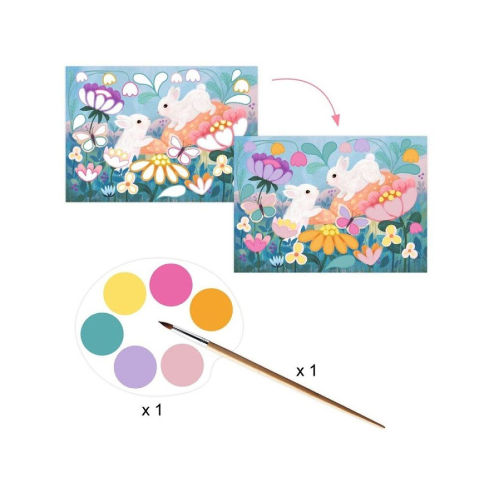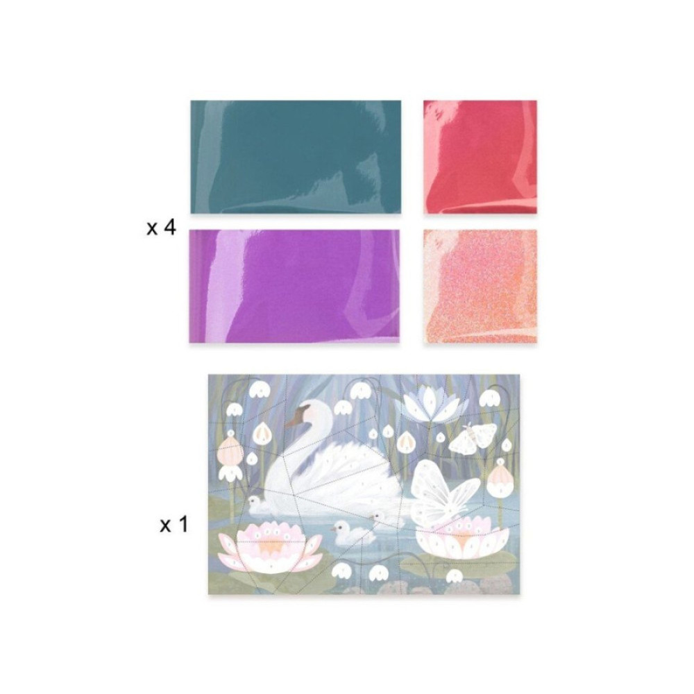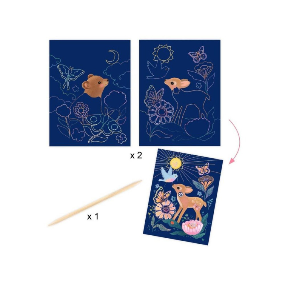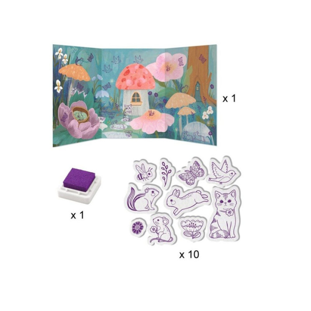Contiene: pintura (1 tablero, 1 paleta y un pincel), tarjetas para rascar (2 tarjetas con efecto metálico y 1 punzón de madera), animales para armar (3 láminas de cartón precortadas), collage (1 tablero con áreas autoadhesivas y 1 láminas de colores), dibujo (1 panel tríptico para completar, 10 sellos de espuma y 1 almohadilla dre tinta morada), imágenes 3D (2 tableros de actividades, 2 láminas impresas con elementos precortados y 1 lámina de pegatinas de espuma de doble cara)