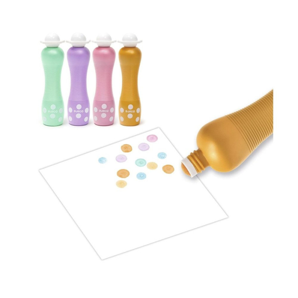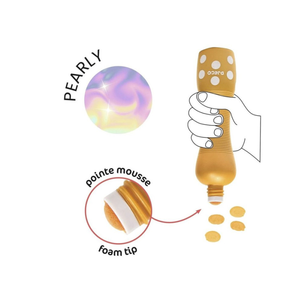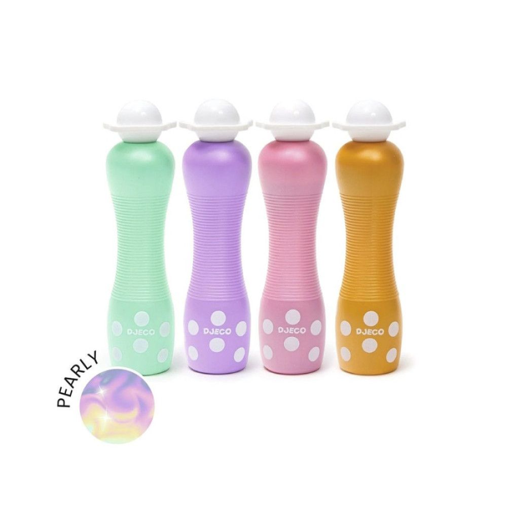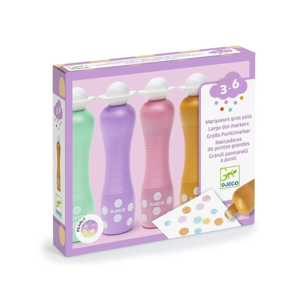 Marcadores de espuma grandes con 4 colores efecto perlado (malva, rosa, verde y amarillo), perfectos para crear puntos y dibujos llamativos. Su diseño ergonómico facilita el agarre por manos pequeñas, ideal para iniciarse en el dibujo y la pintura. La tinta es lavable, por lo que no mancha la ropa ni las manos.