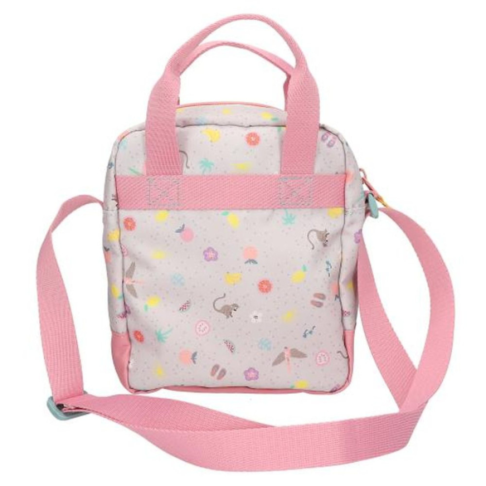Animaladamente afrutado y mono. El bolso bandolera Juicy de TOPModel lleva en la cara delantera dos modelos con un monito sobre un fondo muy alegre de lunares, flores, frutas, pájaros, monos, palmeras y motivos veraniegos. Las asas, la bandolera ajustable y la cremallera son rosa. La cremallera lleva un tirador textil amarillo. En el interior dispone de un bolsillo extra. Cool: en la base del asa lleva una anilla decorativa.