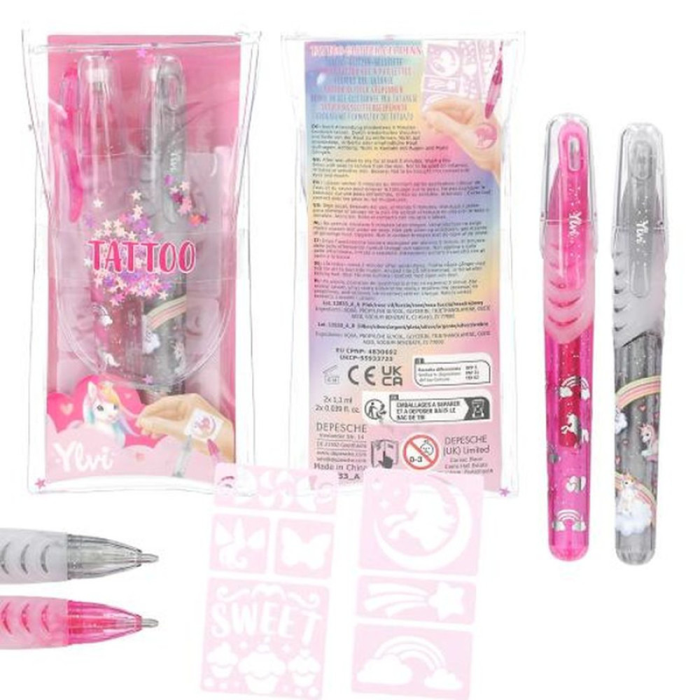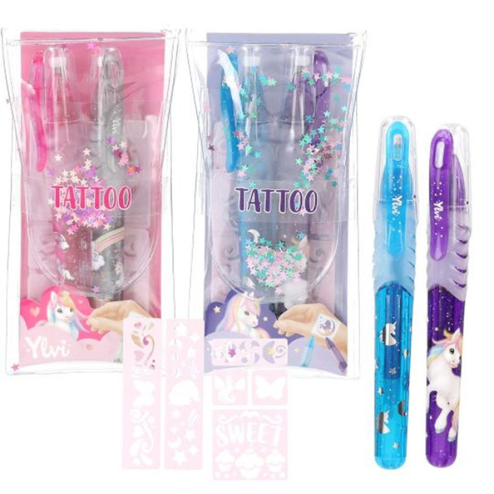 ¡Tatuajes divertidos con Ylvi! El set está compuestos por 2 rotuladores de gel de purpurina para tatuar (rosa/gris, azul/lila) y plantillas adhesivas con motivos monísimos (reutilizables). Viene presentado en un estuche transparente con confeti de estrellitas brillantes en colores a tono en la solapa. Chulo por partida doble, ¡ya que los rotuladores también pueden usarse sobre papel!