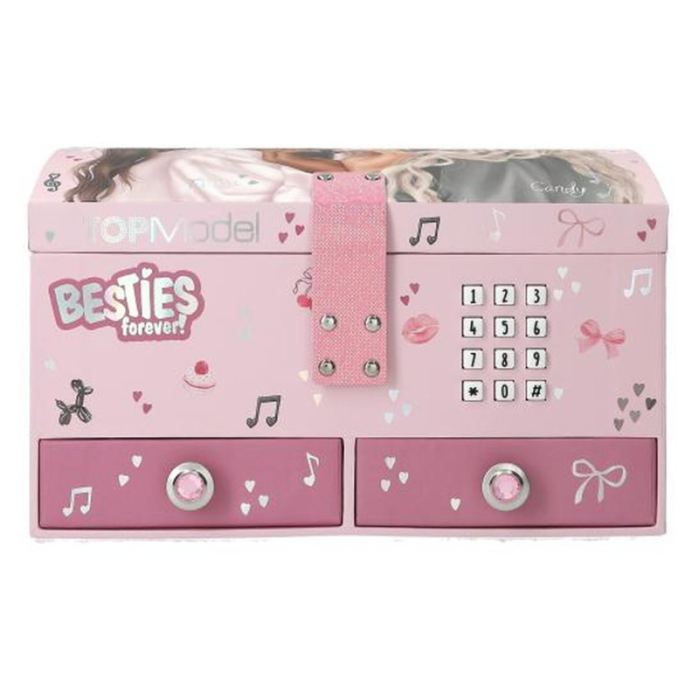 Para joyas o pequeños tesoros y secretos. El joyerito rosa de TOPModel solo puede abrirse si se introduce correctamente un código de 4 dígitos (se puede personalizar y modificar). Al abrirse suena la nueva canción de TOPModel BEST FRIENDS durante 20 segundos aprox. Con bonitos motivos de modelos y monísimos iconos pequeños tanto en el exterior como en el interior. Como espacio de almacenaje cuenta con un compartimento principal, una bandeja extraíble subdividida en tres compartimentos y dos cajones con piedras de estrás en los tiradores.