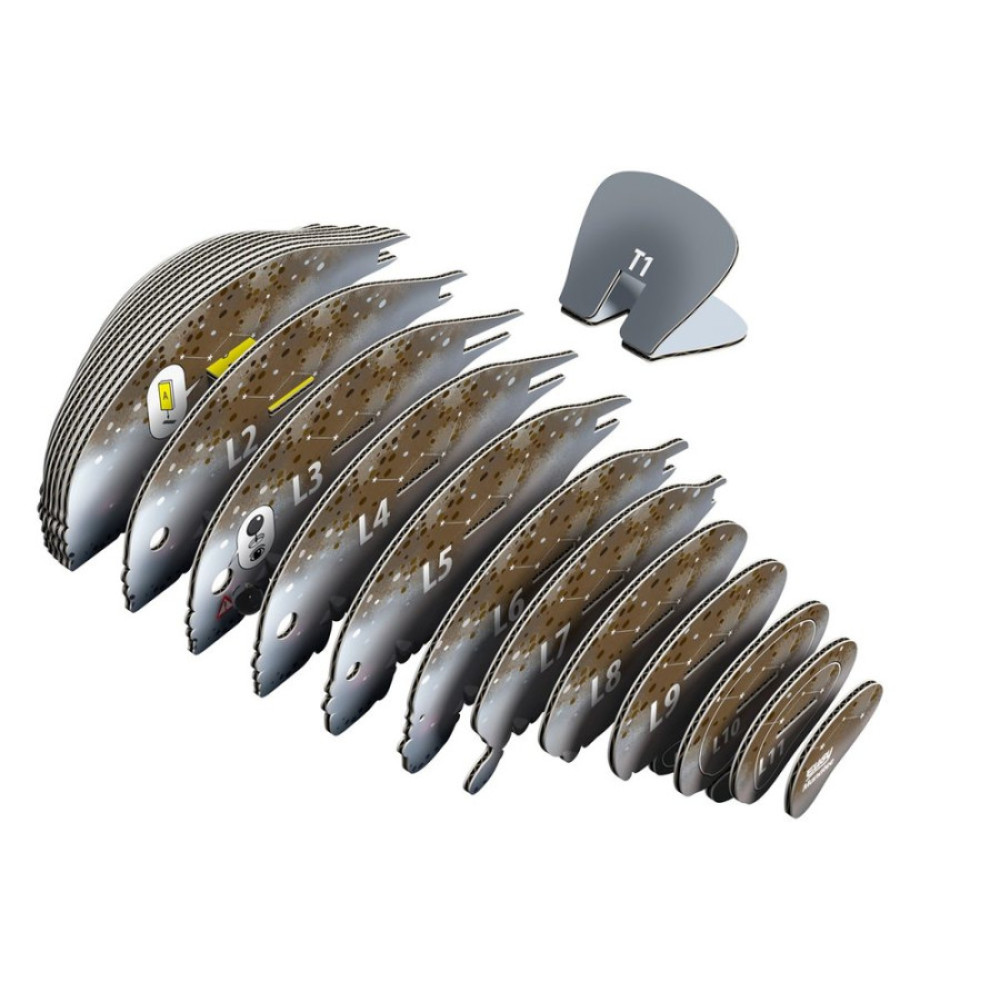 Cada pieza está numerada y se superponen en secuencia numérica usando un pegamento orgánico no tóxico, que viene suministrado.