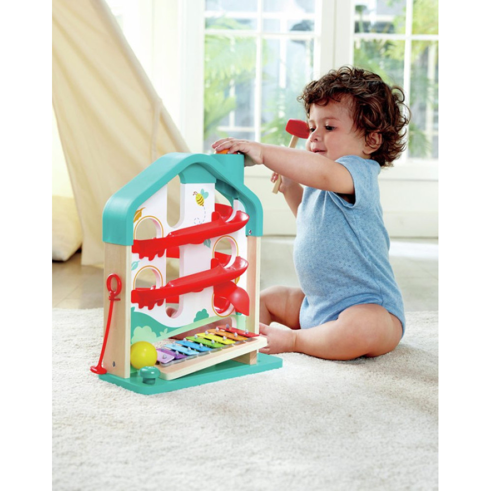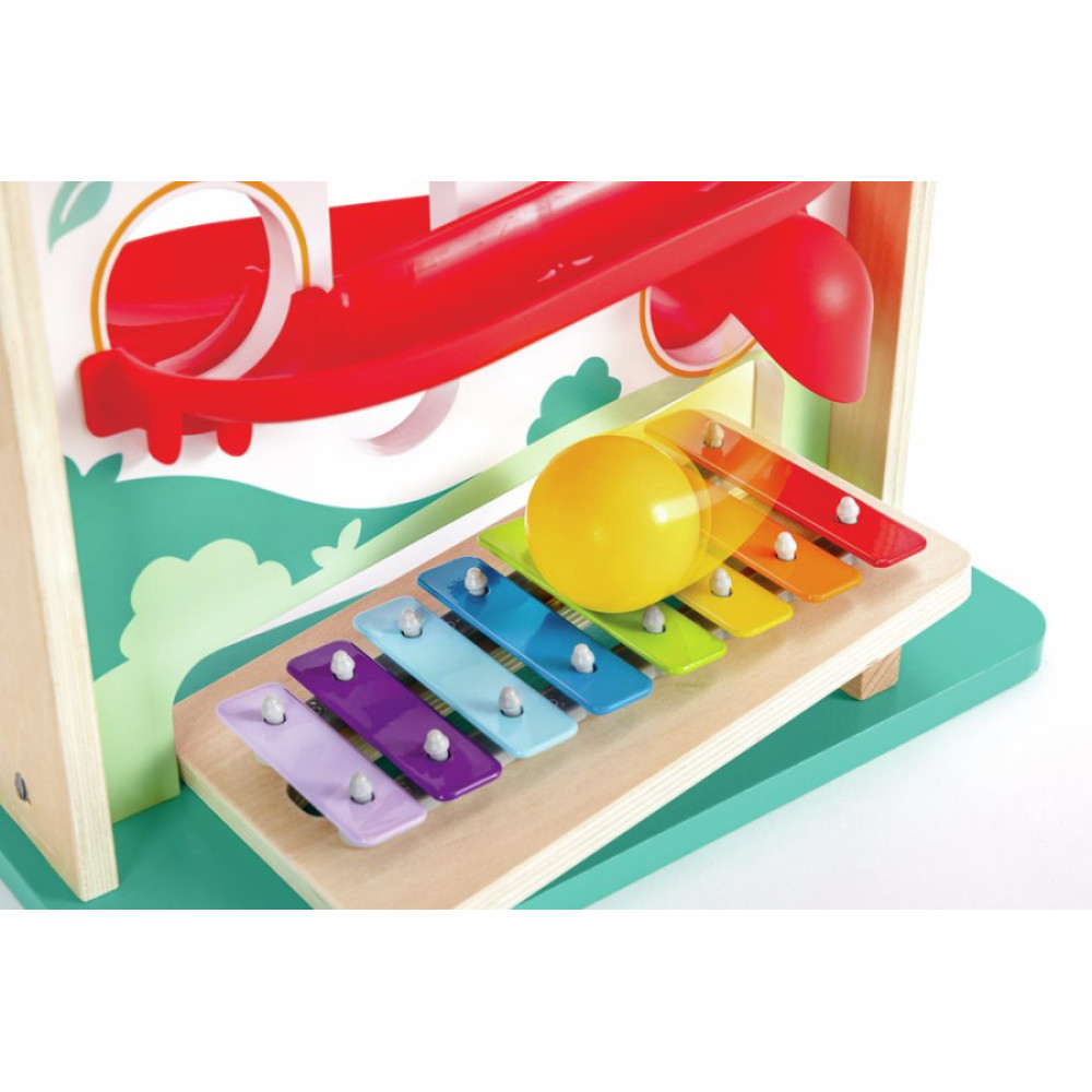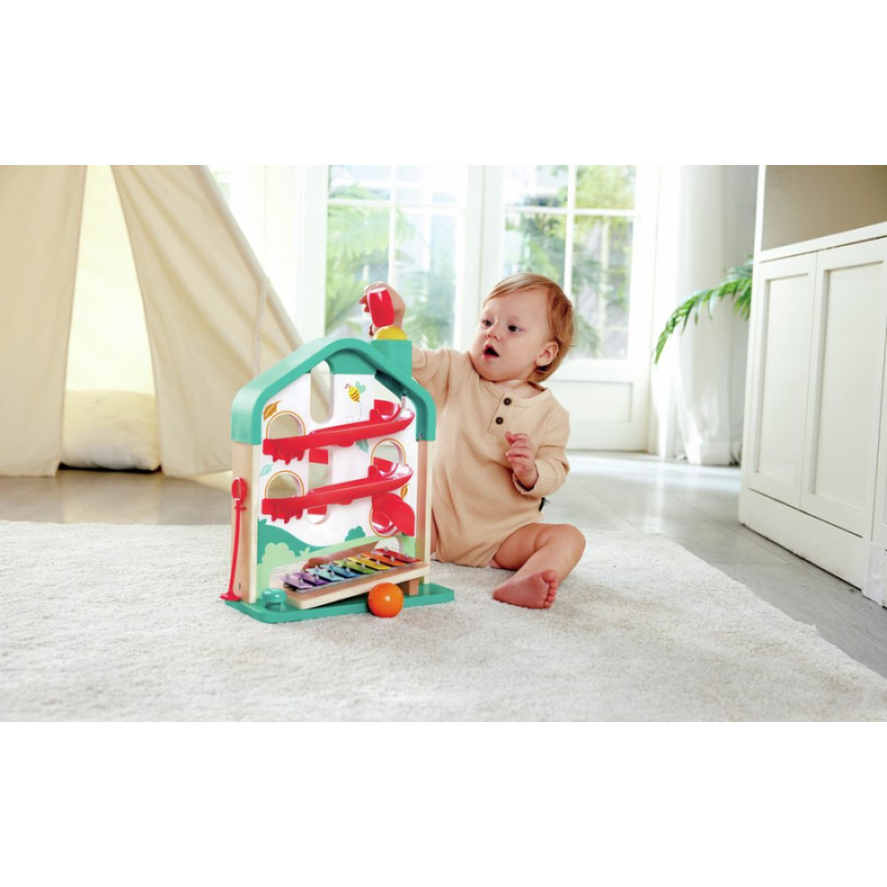 +12 MESES Experimenta la alegría de la música y la diversión de rodar con nuestro juego de bola descendente por una forma de casa. Navega por el laberinto colorido o extrae el xilófono para tocar melodías.
