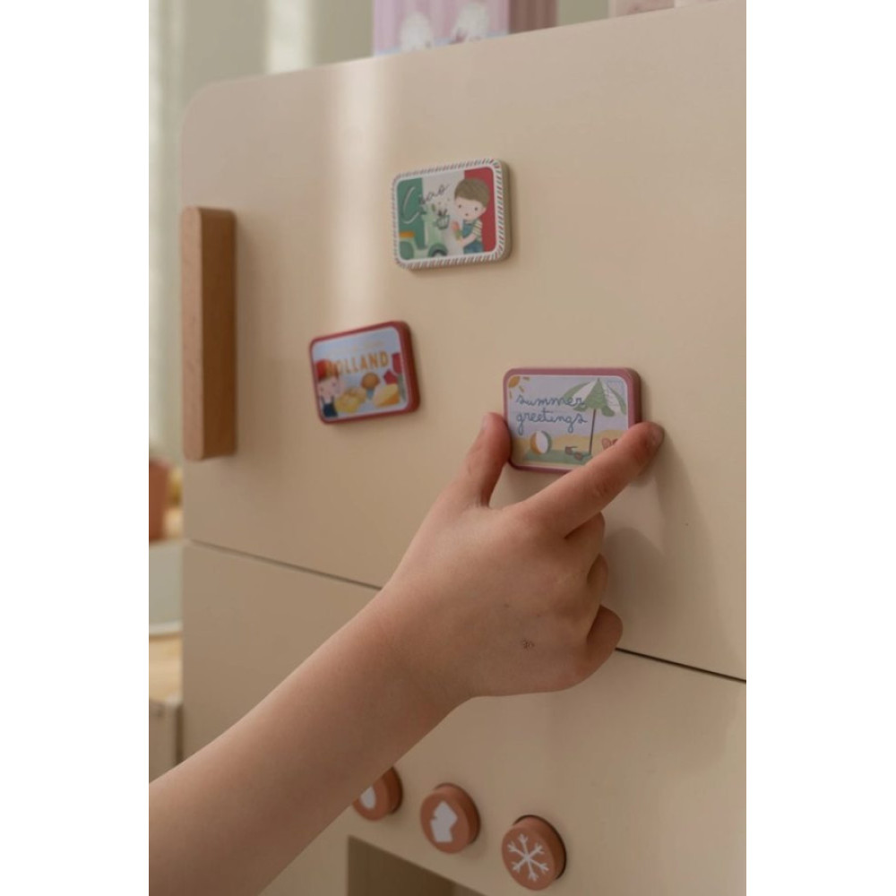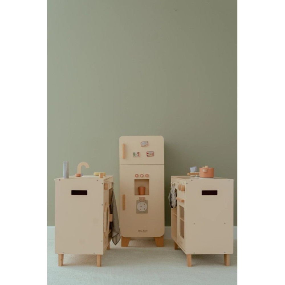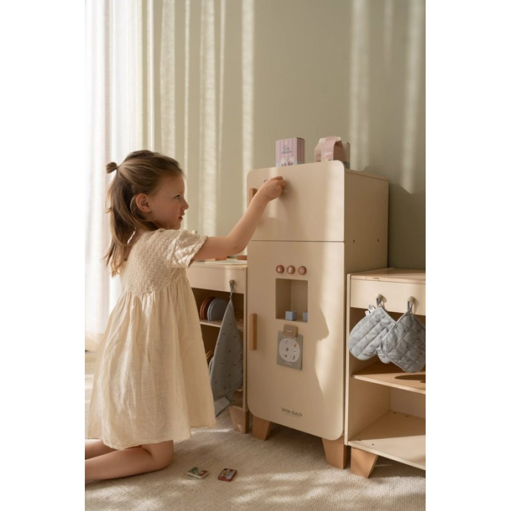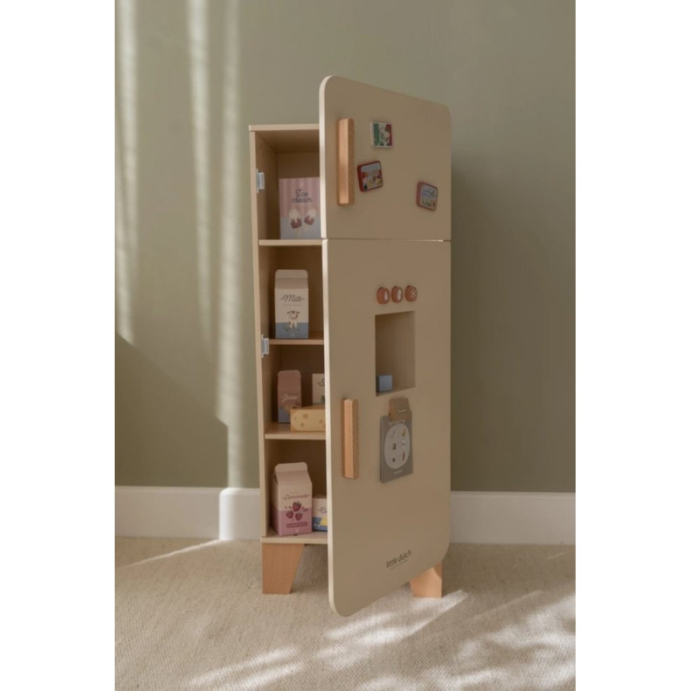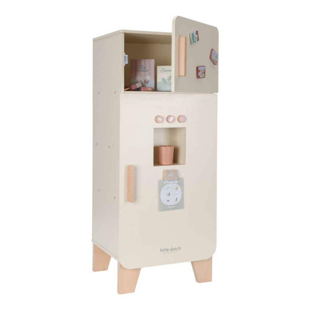 Recomendado +3 años ¡Mantén tus alimentos frescos en esta bonita nevera de madera! La nevera cuenta con un práctico congelador con máquina para hacer cubitos de hielo y amplio espacio para guardar los alimentos de forma ordenada, incluyendo un porta huevos especial. Perfecto para que el juego de simulación en la cocina sea aún más realista. Con esta nevera, los niños se divertirán durante horas mientras aprenden sobre alimentos y su almacenamiento. ¡Un complemento maravilloso para cualquier cocina de juguete!