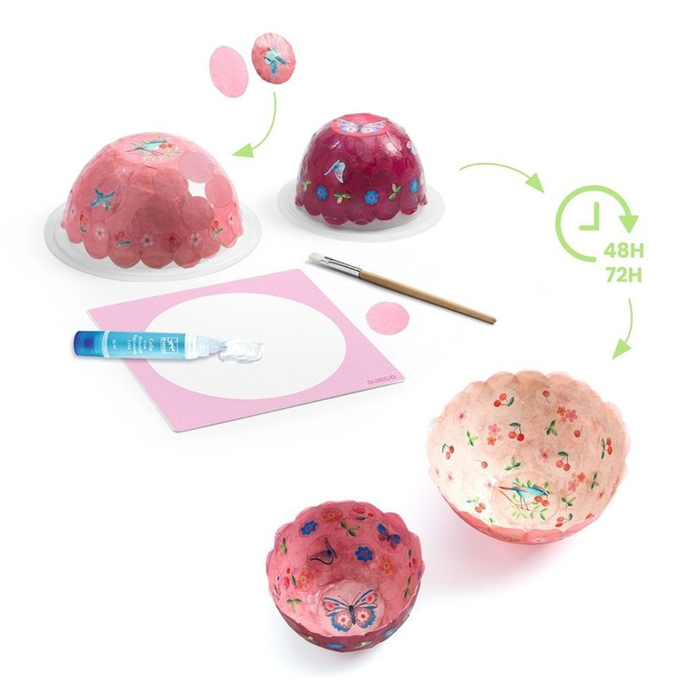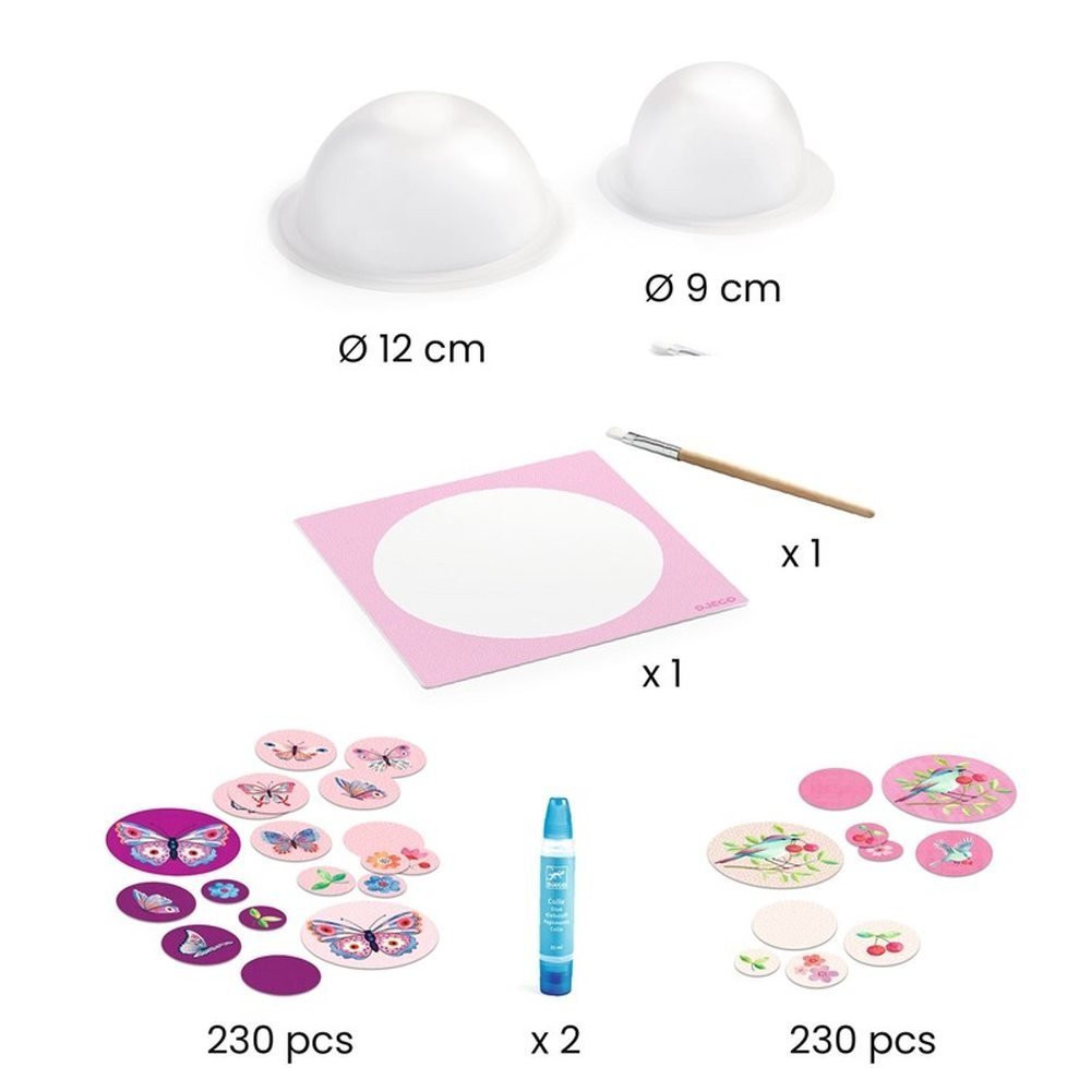 Contenido: dos cuencos (dos tamaños: ø 9 x 5,5 cm / ø 12 x 6 cm), dos tubos de cola líquida, una paleta, una brocha, 4 paquetes de confeti de papel ilustrado grande, una hoja con las instrucciones paso a paso detalladas