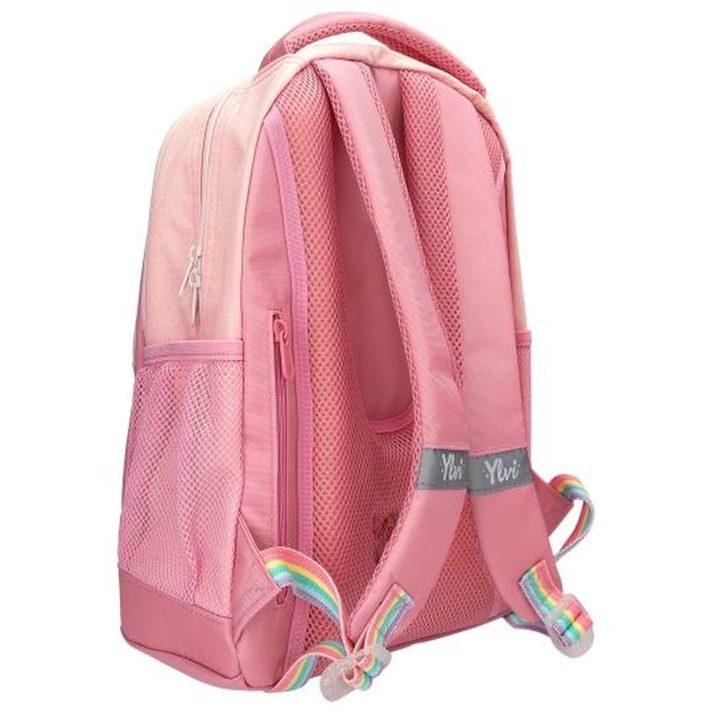 Esta mochila escolar color rosa de Ylvi transmite pura alegría con su unicornio. El motivo de un unicornio a gran tamaño en el bolsillo delantero brilla con el colorido del arcoíris y toda la mochila también brilla con un discreto efecto purpurina. Detalles prácticos: espalda acolchada, base impermeabilizada y antideslizante, tirantes ajustables, asa en la parte de arriba, bolsillos laterales de red, reflectores y elementos de organización en el bolsillo delantero. Material principal: poliéster 100 por 100.